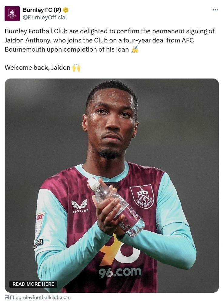直播吧5月23日讯 伯恩利足球俱乐部官方宣布从伯恩茅斯永久签下杰登-安东尼,双方签订了一份为期四年的合同。此前杰登-安东尼以租借形式效力伯恩利,现租借期满完成正式转会。